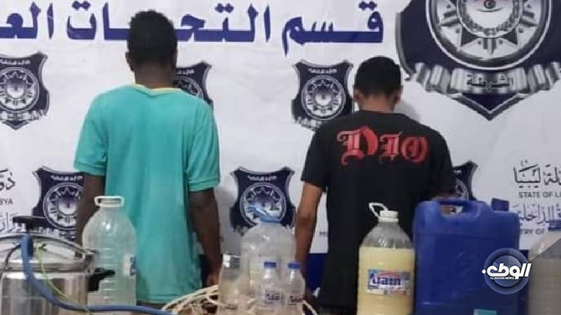 ضبط العاملون في مديرية أمن بنغازي شخصين يقومان بتصنيع الخمور المحلية بموقع إحدى الشركات المهجورة بمنطقة الكيش.