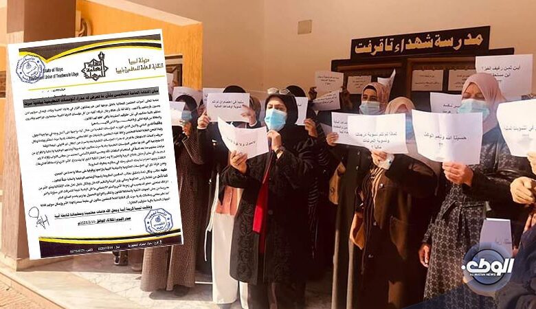 استنكرت النقابة العامة للمعلمين، ونقباء المعلمين بالبلديات، ومعلمو ومعلمات بلدية سرت، وبشدة “وبكل حروف وكلمات الاستهجان” ما تعرض له مدراء المؤسسات التعليمية ببلدية سرت، من اعتقال غير قانوني نتيجة للوقفة الاحتجاجية التي نفذها معلمو المؤسسات التعليمية هناك، مطالبين فيها بتسوية أوضاعهم الوظيفية والمالية والإفراج عن مرتبات بعضهم.