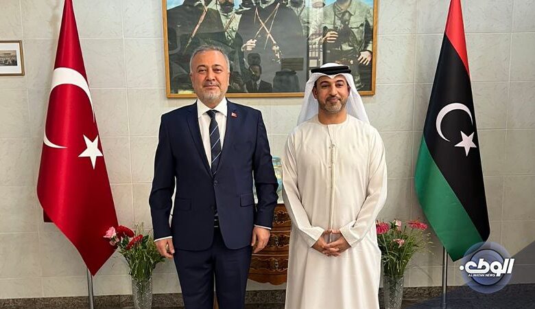 بحث السفير الإماراتي لدى ليبيا، محمد علي الشامسي، مع سفير تركيا لدى ليبيا، كنعان يلماز، سبل تعزيز التعاون الثنائي بين البلدين.