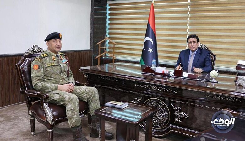 اجتمع رئيس المجلس الرئاسي “محمد المنفي “بصفته القائد الأعلى للجيش الليبي مع رئيس الأركان العامة للمنطقة الغربية “محمدالحداد“لمناقشة الوضع العسكري بشكل عام وسير العمل في نطاق المناطق العسكرية.