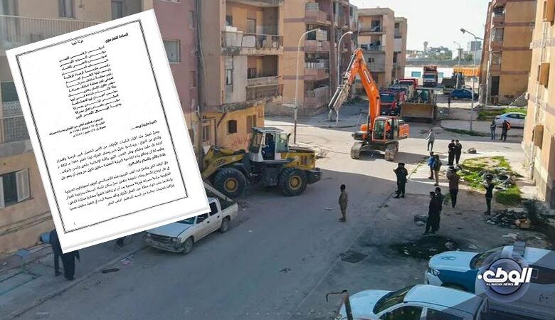 طالب أهالي الحي السكني عمارات القوشي مصراته المجلس الرئاسي ومجلس النواب والمجلس الأعلى للقضاء والنائب العام بعدم المساس بحق سكان الحي من اي جهة كانت