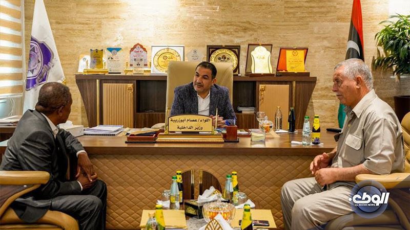 ناقش وزير الداخلية اللواء عصام أبو زريبة مع مُدير الإدارة العامة لأمن المنافذ عثمان عبدالسلام، ومدير أمن منفذ مطار براك الشاطئ عويدات الشريف، الصعوبات التي تواجه عمل المنافذ البرية والبحرية ووضع حلولًا لها.