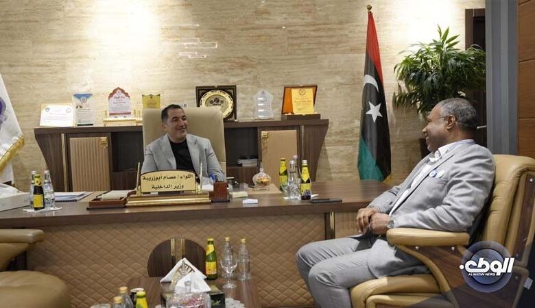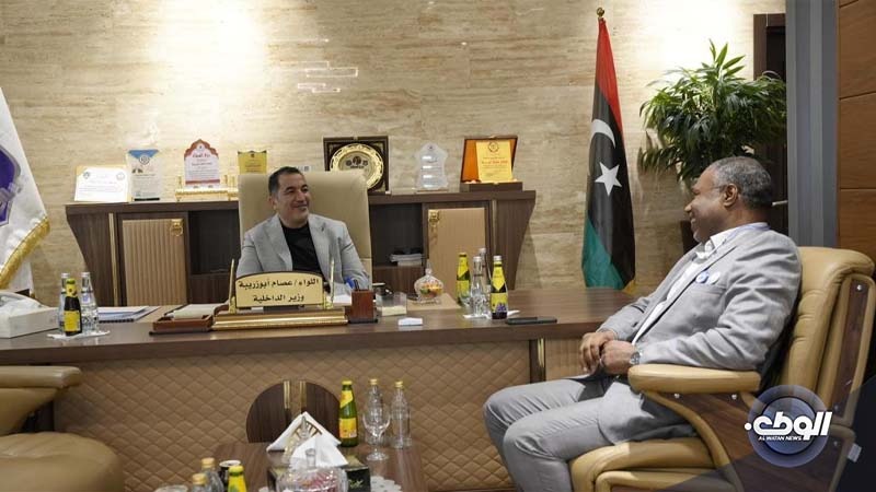 ناقش وَزير الداخلية اللواء “عصام أبوزريبة مع رَئيس ديوان الوَزارة بِالمنطقة الجنوبية اللواء “عبدالسلام الشريف“آلية عمل الديوان فِي تَنفيذالتَعليمات المُوكلة إليه للحفاظ على اِستقرار المنطقة الجنوبية.