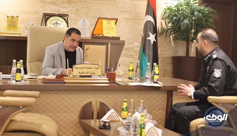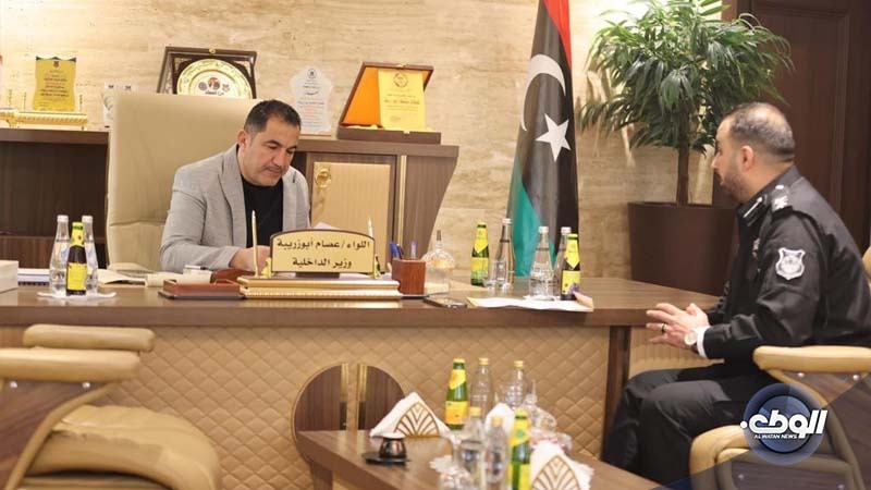ناقش وَزير الداخلية اللواء “عصام أبوزريبة” مع مُعاون رَئيس الإدارة العَامة لِطيران الشُرطة فرع بنغازي المُقدم “إسماعيل الفيس“تَطوراتسيّر العَمل وَآخر الأعمال المُنجزة، وَالمشاكل التي تُواجه فرع الإدارة وَطائرات الشُرطة، وَتوفير اِحتياجاتها وَاقتراح الحلول لِحلها بهدف إنجاحالمهام المُكلفة بِهَا إدارة طيران الشُرطة.