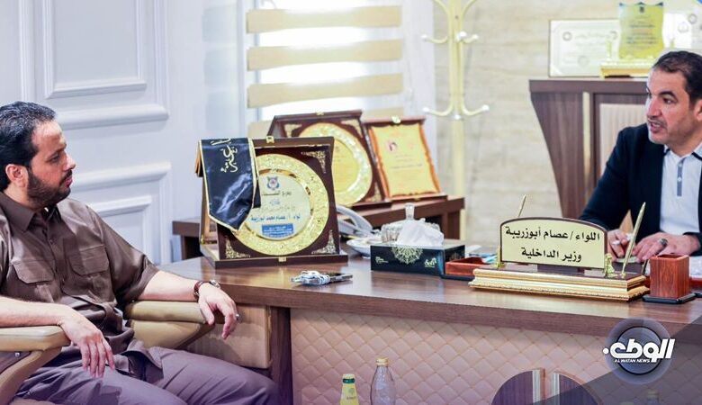 اجتمع وزير الداخلية في الحكومة الليبية اللواء “عصام أبوزريبة” مع آمر اللواء 128 العميد “حسن الزادمة” لمناقشة آلية التعاون بين الوزارة والقوات المسلحة بشأن الجوانب الأمنية ومكافحة الجريمة المنظمة والإرهاب والهجرة غير الشرعية وتأمين الحدود من عمليات التهريب.