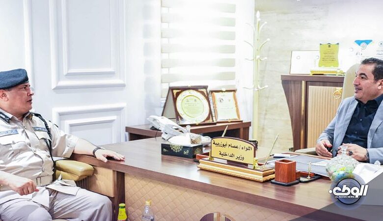 بحث وزير الداخلية بالحكومة الليبية، اللواء عصام أبو زريبة، مع مدير مديرية أمن البيضاء – الجبل الأخضر، اللواء خالد البسطة، الأوضاع الأمنية وسبل تعزيز الاستقرار في المدية ، وخطة المديرية لتأمين انتخابات المجالس البلدية ومراكز الاقتراع، وآلية التعاون بين المديرية والأجهزة الأمنية لتنفيذ عملية التأمين على أكمل وجه.