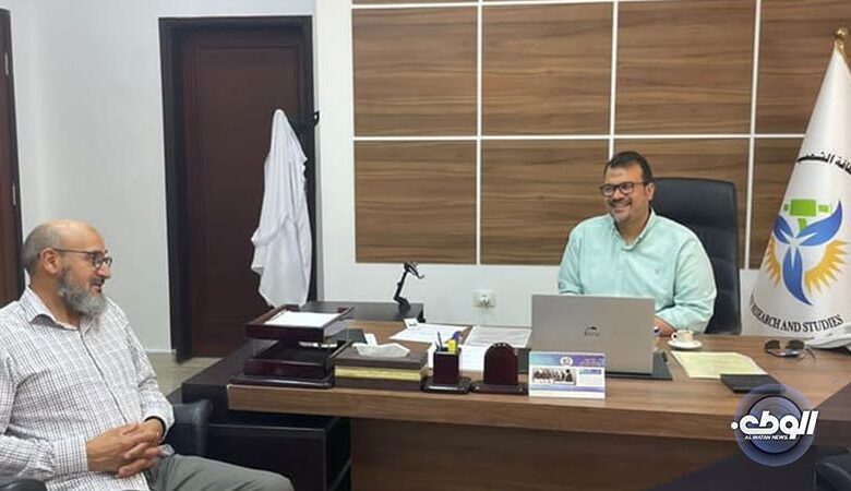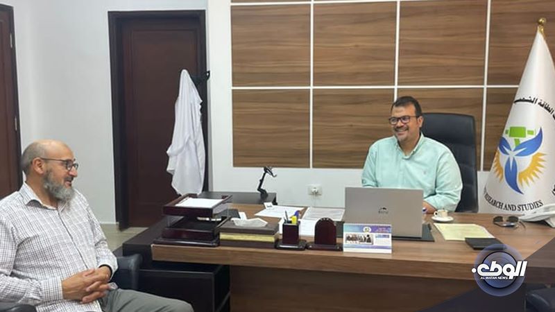 بحث مدير مركز بحوث ودراسات الطاقات المتجددة والتنمية المستدامة بجامعة وادي الشاطئ أبو بكر اعويدات، مع المدير العام للمركز الليبي لبحوث ودراسات الطاقة الشمسية في طرابلس يوسف النعاس، أوجه التعاون بين الجانبين.