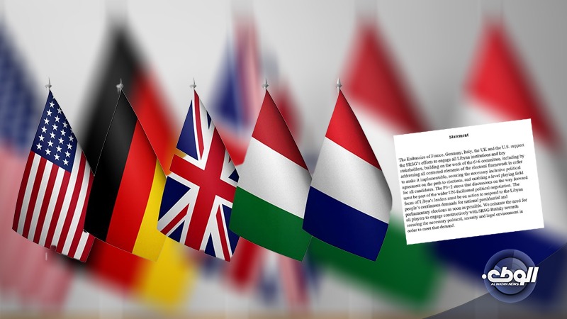 أعلنت الدول الخمس “الولايات المتحدة وبريطانيا وفرنسا والمانيا وإيطاليا” في بيان مشترك دعمها لجهود المبعوث الأممي “عبدالله باتيلي” لإشراك جميع الأطراف لمعالجة النقاط الخلافية في القوانين الانتخابية الصادرة عن لجنة 6+6 لجعلها قابلة للتنفيذ.
