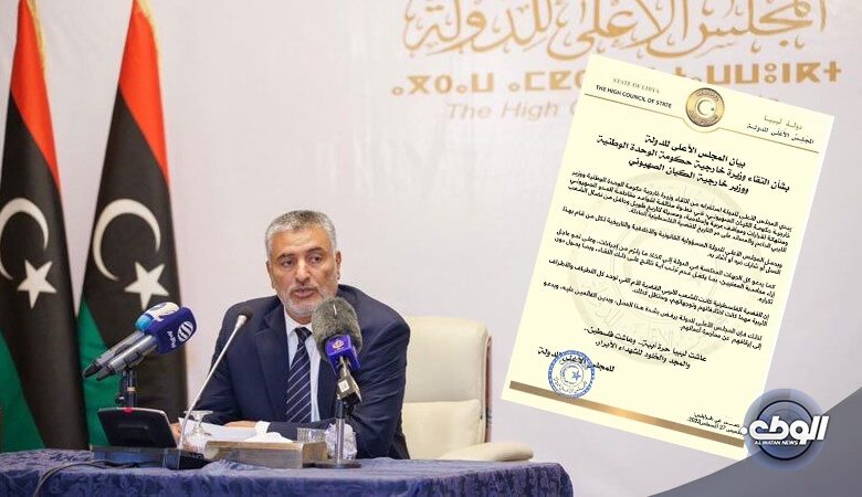 أصدر مجلس الدولة بياناً بشأن التقاء وزيرة خارجية الحكومة منهية الولاية بوزير خارجية الكيان الصهيوني أبدى فيه المجلس استغرابه من هذا اللقاء في خطوة مخالفة لقواعد مقاطعة العدو الصهيوني ومنتهكة لقرارات ومواقف عربية وإسلامية، ومسيئة لتاريخ طويل وحافل من نضال الشعب الليبي الداعم والمساند على مر التاريخ للقضية الفلسطينية العادلة.