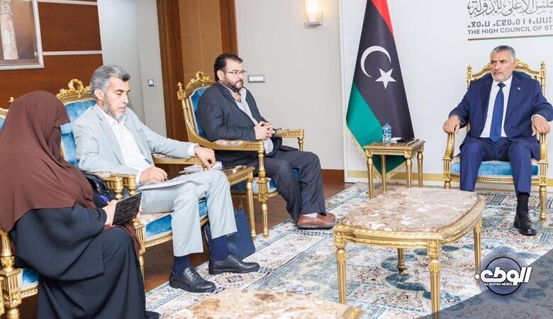 كما تم التطرق خلال اللقاء إلى ملف الانتخابات والسبل الكفيلة لزحزحة كافة العوائق والعراقيل لإجراء الاستحقاق الانتخابي الذي يتطلع اليه كل الليبيين، الأمر الذي يوليه مجلس الدولة كل الاهتمام ويسعى إلى تحقيقه في أقرب الآجال.