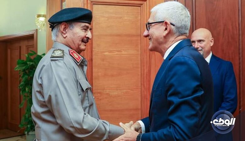 استقبل القائد العام للقوات المُسلحة العربية الليبية المُشير أركان حرب “خليفة ابوالقاسم حفتر” في مكتبه بمقرّ القيادة العامة – بنغازي الجنرال “جنارو ڤيكيوني” على رأس وفد رفيع المستوى من الحكومة الإيطالية، وذلك لمناقشة آخر المستجدات حول تداعيات كارثة العاصفة دانيال،
