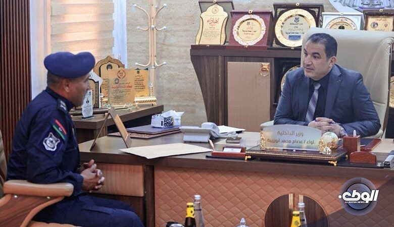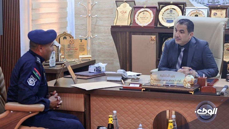 التقى وزير الداخلية في الحكومة الليبية لواء عصام أبوزريبة صباح اليوم الأحد بديوان الوزارة في بنغازي مدير فرع الادارة العامة للتفتيش والمتابعة بالمنطقة الجنوبية لواء عمر محمد عثمان.