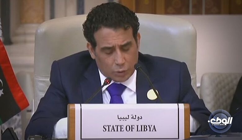 دعا رئيس المجلس الرئاسي محمد المنفي خلال القمة العربية والإسلامية المشتركة غير العادية في الرياض، إلى ترجمة المواقف بشأن فلسطين إلى قرارات ملزمة التنفيذ.