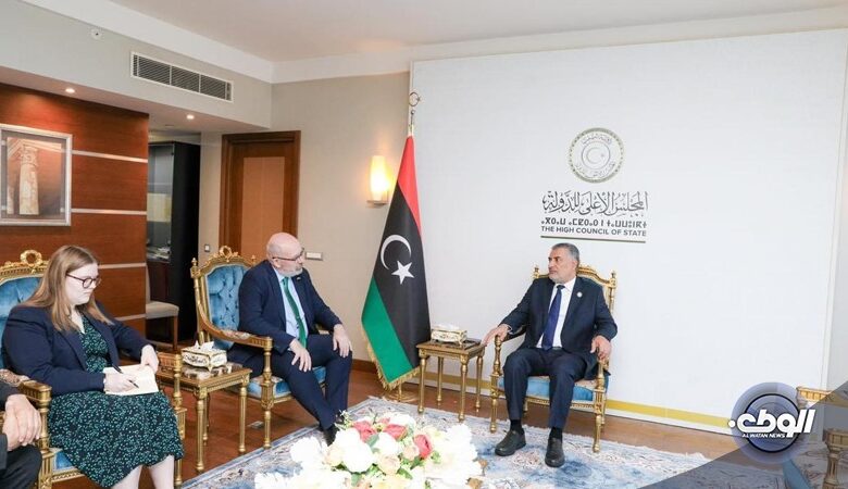 بحث رئيس مجلس الدولة محمد تكالة، مع سفير المملكة المتحدة لدى ليبيا مارتن لونغدن، الأربعاء، في مقر المجلس بالعاصمة طرابلس، تطورات العملية السياسية في ليبيا.