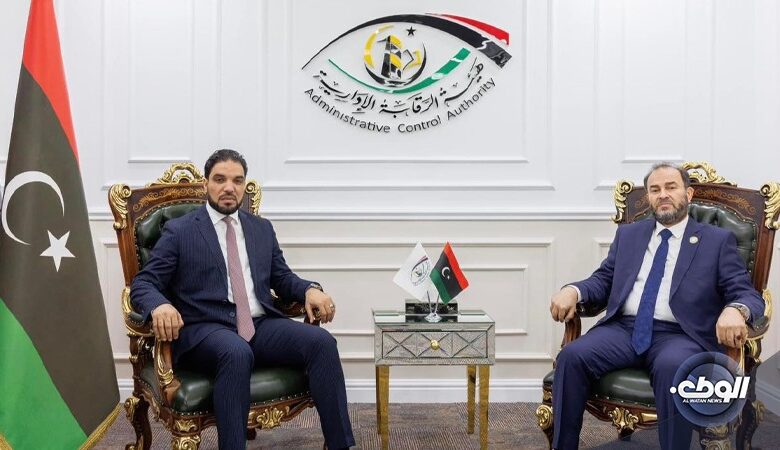 بحث النائب الثاني لرئيس مجلس الدولة عمر العبيدي، مع رئيس هيئة الرقابة الإدارية عبدالله قادربوه، اليوم الأربعاء، بمقر الهيئة بطرابلس، تقييم ودعم ورفع وتيرة العمل الرقابي الإداري والوقوف على أهم التحديات والصعوبات التي تواجهه.
