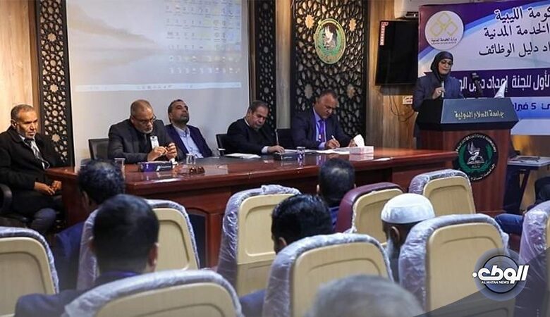 عقدت وزارة الخدمة المدنية بالحكومة الليبية اجتماعًا تمهيديًا لوصف الوظائف العامة وتسمياتها في مدينة بنغازي، وذلك برعاية الوزير محمود أبونعامة في جامعة السلام الدولية، وبحضور عدد من الوزراء ورؤساء الهيئات الحكومية، بالإضافة إلى مجموعة من أعضاء هيئة التدريس والمهتمين بالشأن العام.