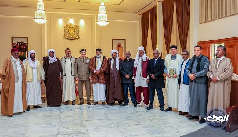 استقبل القائد العام للقوات المسلحة المشير خليفة حفتر وفدًا من مشائخ وأعيان قبيلة الحساونة، حيث تبادل الجانبان التهاني والتقدير، وتأكيد الوفد على دعمهم الكامل للجهود الرامية لضمان الأمن والاستقرار في المناطق الليبية.