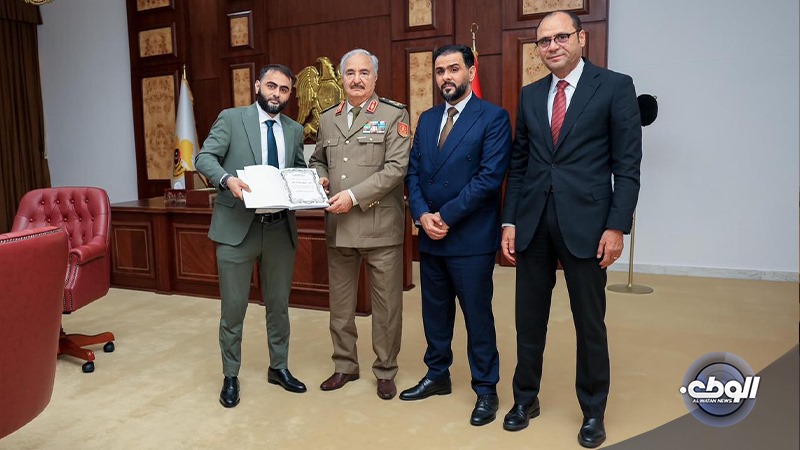 بحث القائد العام للقوات المسلحة الليبية المشير خليفة حفتر، في مكتبه بمقرّ القيادة العامة، مع رئيس الحكومة الليبية أسامة حماد، ووزير الصحة بالحكومة الليبية عثمان عبد الجليل، آخر المستجدات بملف الصحة.