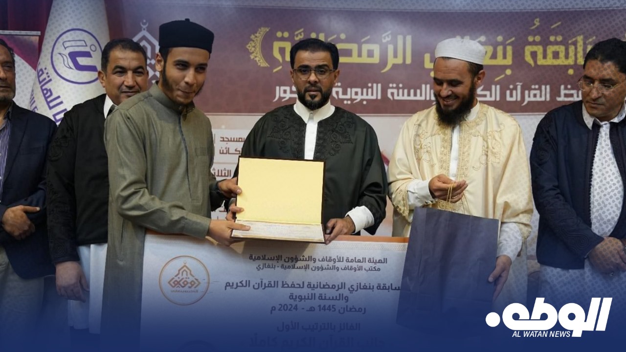 شارك رئيس الحكومة الليبية أسامة حماد رفقة وزير الهيئة العامة الأوقاف والشؤون الإسلامية عاطف العَبِيدي ووزيرالداخلية اللواء عصام بوزريبة ووزير العمل والتأهيل عبد الله الشارف ارحومة ورئيس جهاز البحث الجنائي اللواء صلاح هويدي ووزير الثروة البحرية علي بن يونس، في فعاليات مسابقة بنغازي لحفظ القرآن الكريم والسنة النبوية والمؤذن والخطيب الصغير، التي ينظمها مكتب الأوقاف والشؤون الإسلامية بنغازي