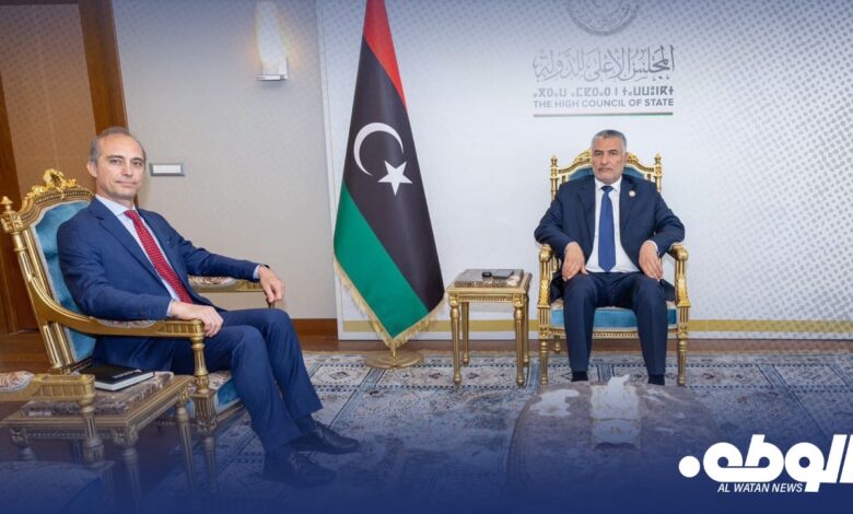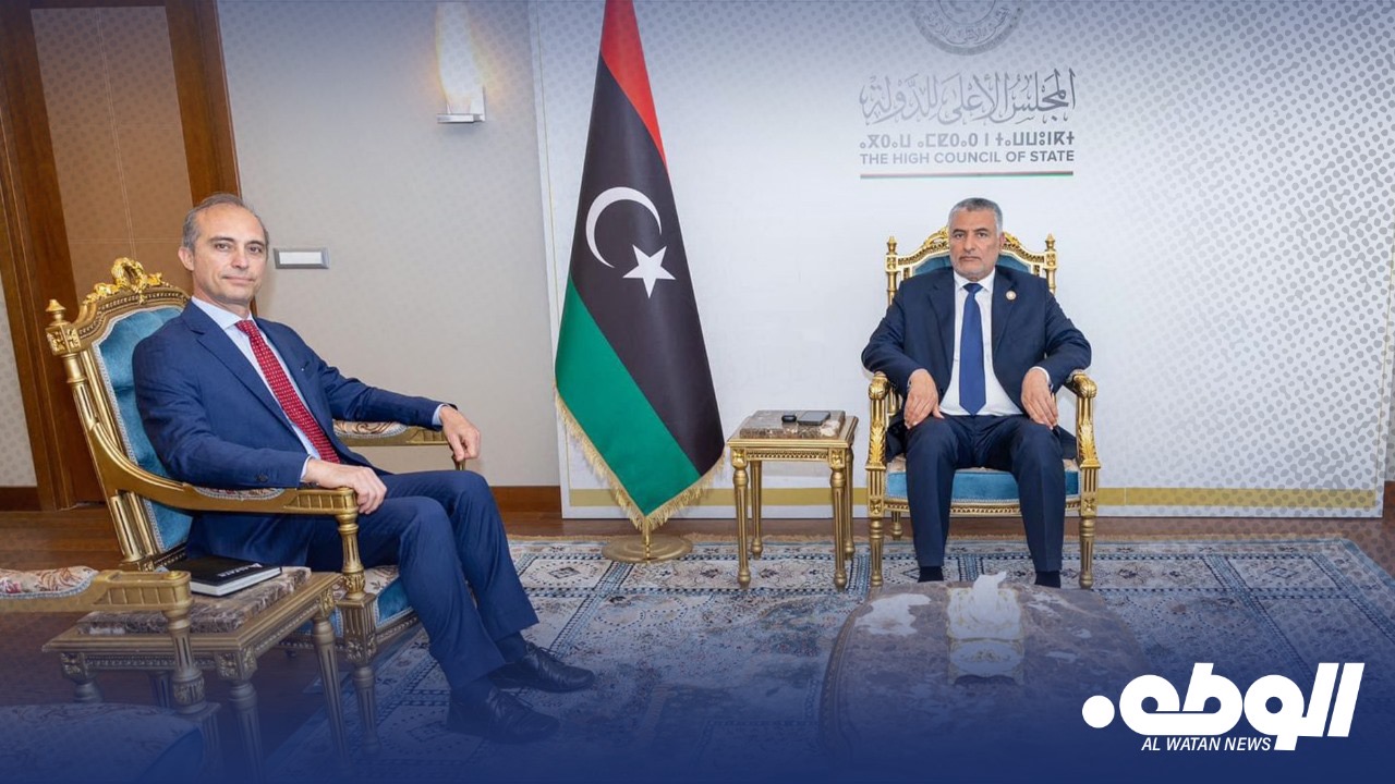 بحث رئيس مجلس الدولة محمد تكالة، مع السفير الإيطالي لدى ليبيا جيانلوكا ألبيريني، اليوم الخميس، بمقر المجلس، ملفات التعاون المشترك وسبل تعزيز العلاقات وتطويرها بما يخدم مصلحة البلدين.