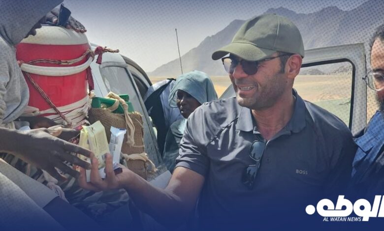وخلال هذه الجولة في صحراء الكفرة العوينات، تم العثور على عدد من العائلات والأطفال السودانية النازحة إلى مدينة الكفرة، وقدم لهم وزير الصحة وجهاز الهجرة غير الشرعية بعض المستلزمات الغذائية والمياة؛ نظراً لأنهم يعانون من الضمأ الشديد والعطش في الطقس الحار بالصحراء.