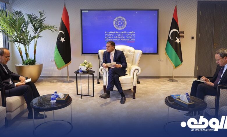 بحث رئيس الحكومة المنتهية عبدالحميد الدبيبة، مع سفير إيران لدى ليبيا عين الله سوري، اليوم الخميس، أوجه التعاون بين البلدين.