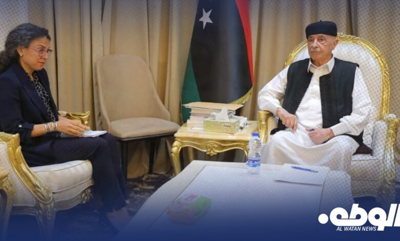 استقبل رئيس مجلس النواب، المستشار عقيلة صالح، في مكتبه بمدينة القبة، القائمة بأعمال رئيس بعثة الأمم المتحدة للدعم في ليبيا، ستيفاني خوري، والوفد المرافق لها.