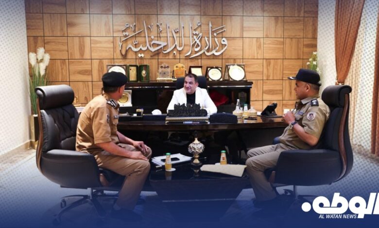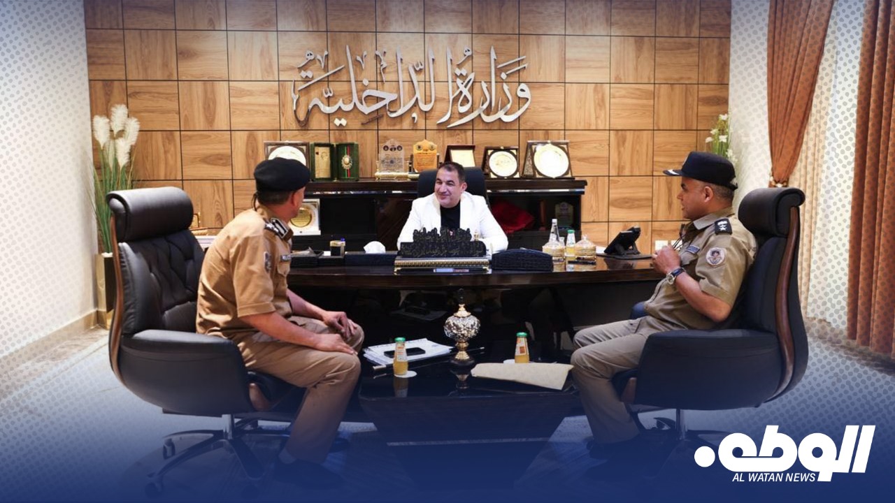 التقى وزير الداخلية، اللواء عصام أبوزريبة، خلال اجتماع في مكتبه بديوان الوزارة مع مدير الإدارة العامة للشرطة الكهربائية فرع المنطقة الشرقية، العميد محمد اللوزي، ومدير الإدارة فرع بنغازي، العقيد أيمن هويدي.