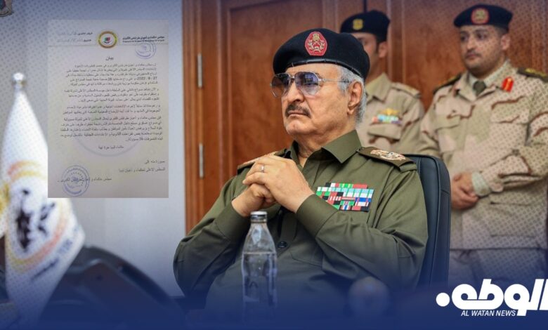 أعربت القيادة العامة للقوات المسلحة الليبية عن ترحيبها بقرار مجلس النواب الليبي الصادر في جلسته الرسمية يوم الثلاثاء، 13 أغسطس 2024، بسحب صفة وصلاحيات القائد الأعلى من الرئاسي و التى يملكها مجلس النواب صاحب الشرعية الدستورية وهو الجسم السياسي الوحيد المنتخب من قبل الشعب الليبي