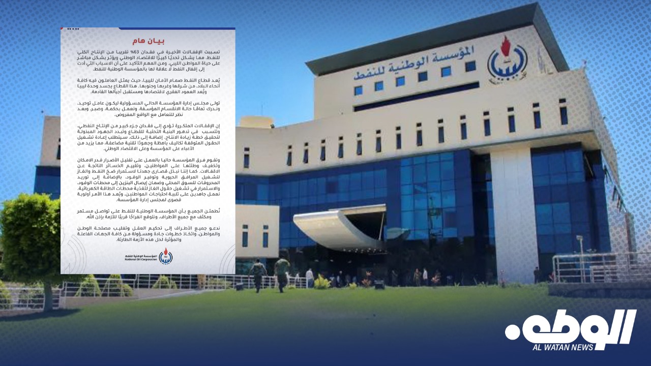 وأكدت المؤسسة أنها في تواصل مستمر ومكثف مع جميع الأطراف المعنية، معربة عن أملها في انفراج قريب للأزمة. وأوضحت أنها تبذل جهودًا حثيثة لتقليل الأضرار الناجمة عن الإقفالات، ولتخفيف وطأتها على المواطنين، مشيرة إلى أنها تعمل بكل طاقتها لضمان استمرار ضخ النفط والغاز، لتشغيل المرافق الحيوية، وتوفير الوقود والمحروقات للسوق المحلي.