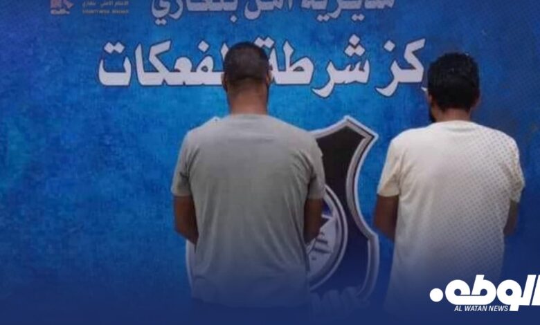 ألقى مركز شرطة الفعكات التابع لمديرية أمن بنغازي القبض على شخصين من الجنسية المصرية قاما بسرقة أغراض من منزل مواطن.