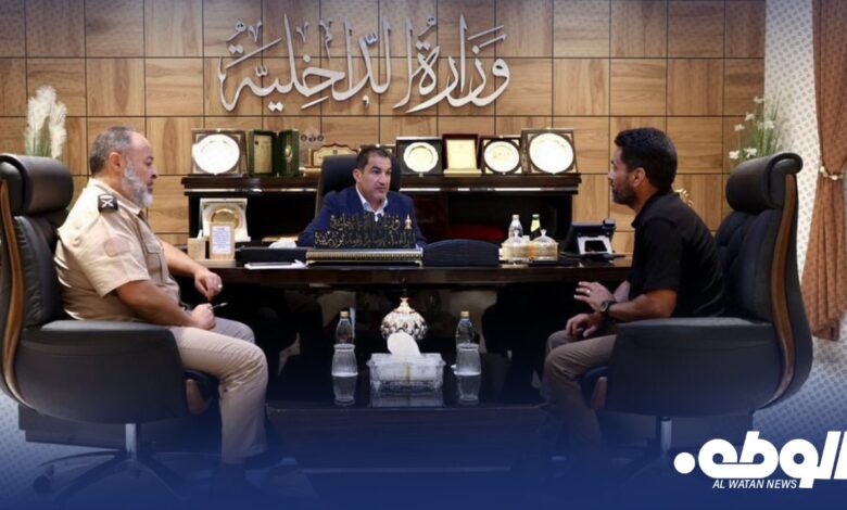 بحث وزير الداخلية بالحكومة الليبية عصام أبوزريبة، مع مدير إدارة المشروعات بالوزارة محمد الكزة، اليوم الاثنين، في مكتبه بمدينة بنغازي، حالة المرافق والمنشآت التابعة للوزارة في جميع المدن والمناطق.