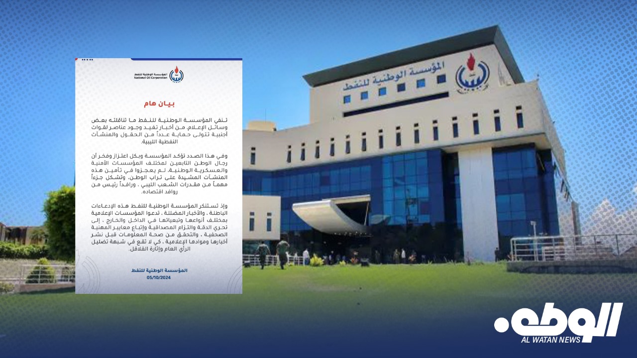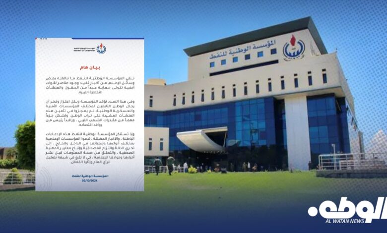 واستنكرت المؤسسة الوطنية للنفط هذه الإدعاءات الباطلة، والأخبار المضللة، حيث دعت المؤسسات الإعلامية بمختلف أنواعها وتبعياتها في الداخل والخارج، إلى تحري الدقة والتزام المصداقية وإتباع معايير المهنية الصحفية، والتحقق من صحة المعلومات.