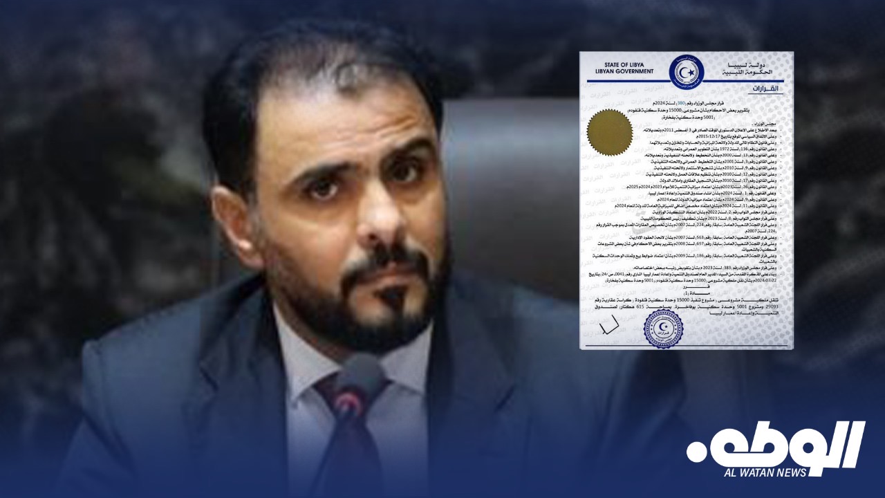 أصدر مجلس وزراء الحكومة الليبية اسامة حماد اليوم القرار رقم 380 لسنة 2024م، بتقرير بعض الأحكام بشأن مشروع 15000 وحدة سكنية بقنفودة، و5001 وحدة سكنية بفخارة.