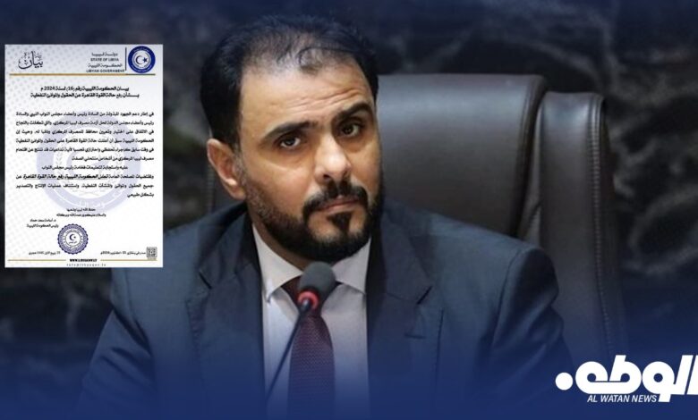 وذكر البيان أن هذا الإجراء الذي اتخذته الحكومة الليبية استجابة لتعليمات رئيس مجلس النواب، يأتي في إطار دعم الجهود المبذولة من رئيس وأعضاء مجلس النواب وأعضاء مجلس الدولة لحل أزمة مصرف ليبيا المركزي والتي تكللت بالنجاح في الاتفاق على اختيار محافظ للمصرف المركزي ونائب له.