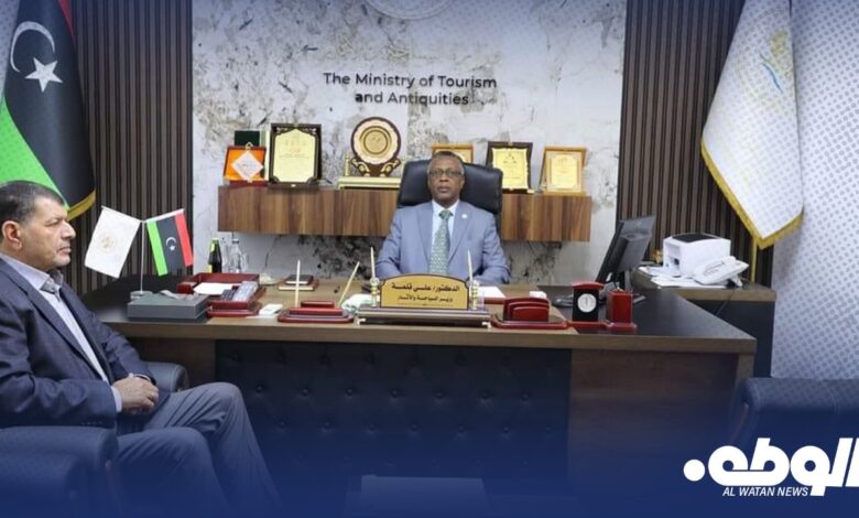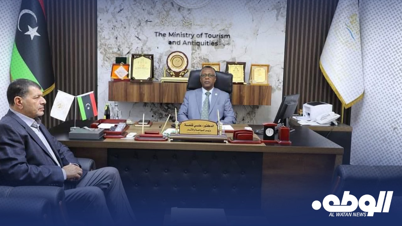 بحث وزير السياحة والآثار بالحكومة الليبية علي قلمة، مع رئيس اللجنة التسييرية لجهاز إدارة وتطوير المنتزهات الوطنية صالح الاحيمر، في مكتبه بمدينة بنغازي، سبل تطوير المنتزهات الوطنية كجزء من استراتيجية الوزارة لدعم القطاع السياحي وتحقيق التنمية المستدامة.