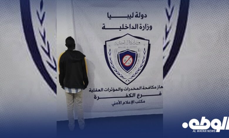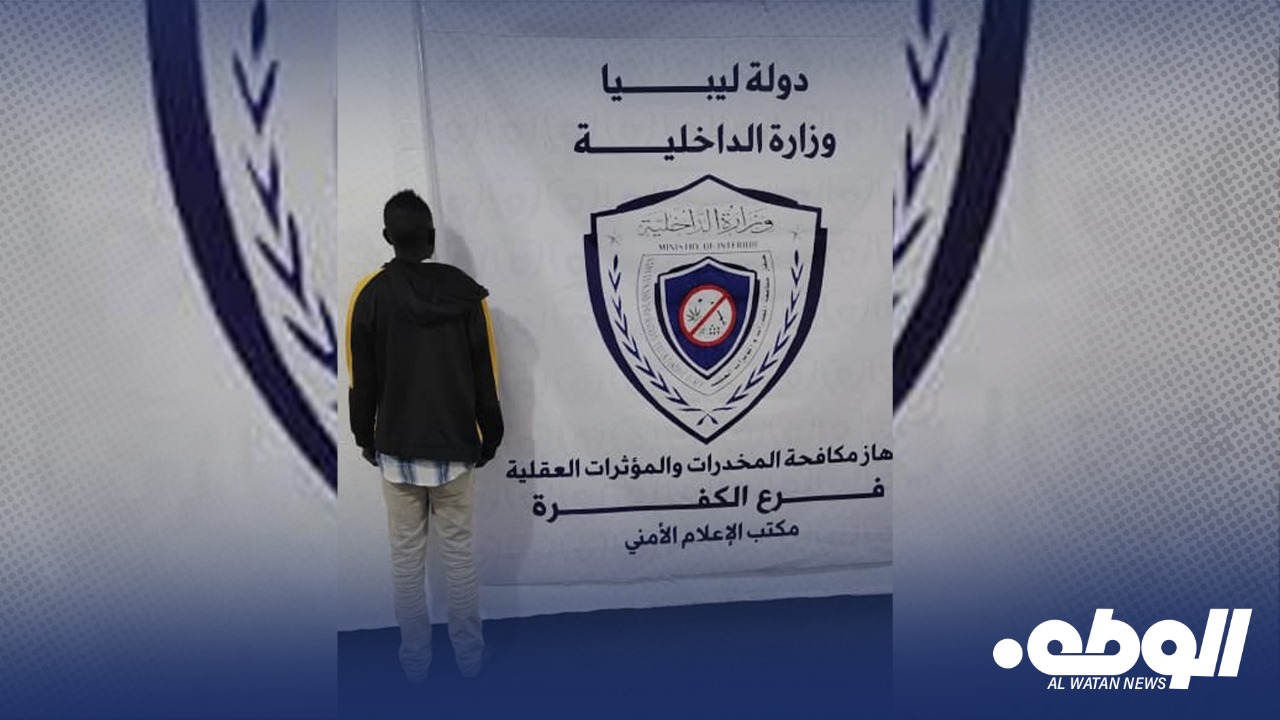 تمكن جهاز مكافحة المخدرات والمؤثرات العقلية فرع الكفرة من ضبط شخص سوداني الجنسية بتهمة تصنيع وترويج الخمور محلية الصنع، وذلك بعد إعداد كمين محكم أسفر عن القبض عليه وبحوزته قنينة تحتوي على مادة شفافة يُشتبه بأنها خمر محلي الصنع.