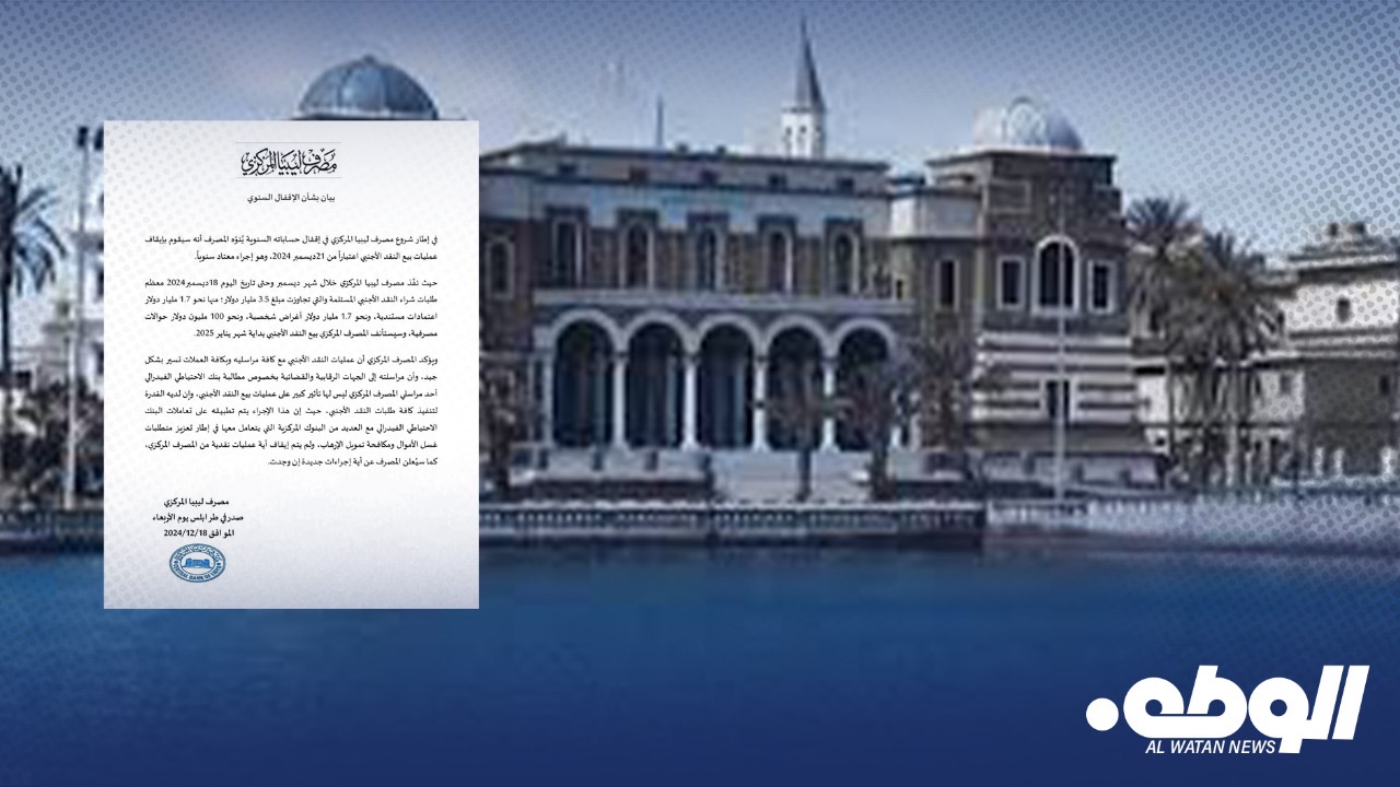 أعلن مصرف ليبيا المركزي عن إيقاف عمليات بيع النقد الأجنبي اعتبارًا من 21 ديسمبر 2024، وذلك في إطار إجراء سنوي معتاد لإقفال حساباته السنوية.