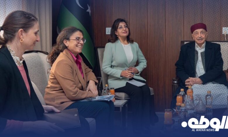 التقى رئيس مجلس النواب المستشار عقيلة صالح، اليوم الإثنين، نائبة الممثل الخاص للأمين العام والقائمة بأعمال رئيس بعثة الأمم المتحدة للدعم في ليبيا ستيفاني خوري .