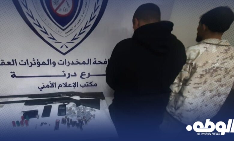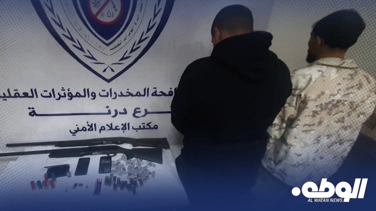 تمكن جهاز مكافحة المخدرات والمؤثرات العقلية، فرع درنة، من ضبط شخصين في منطقة أم الرزم بحوزتهما مواد مخدرة وأسلحة.