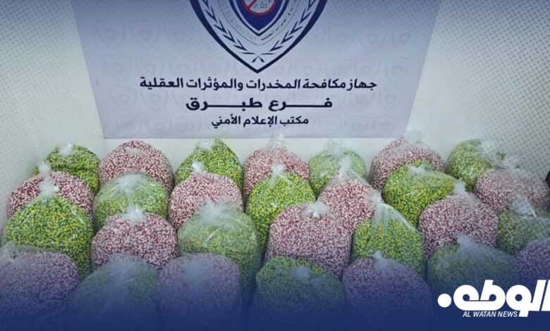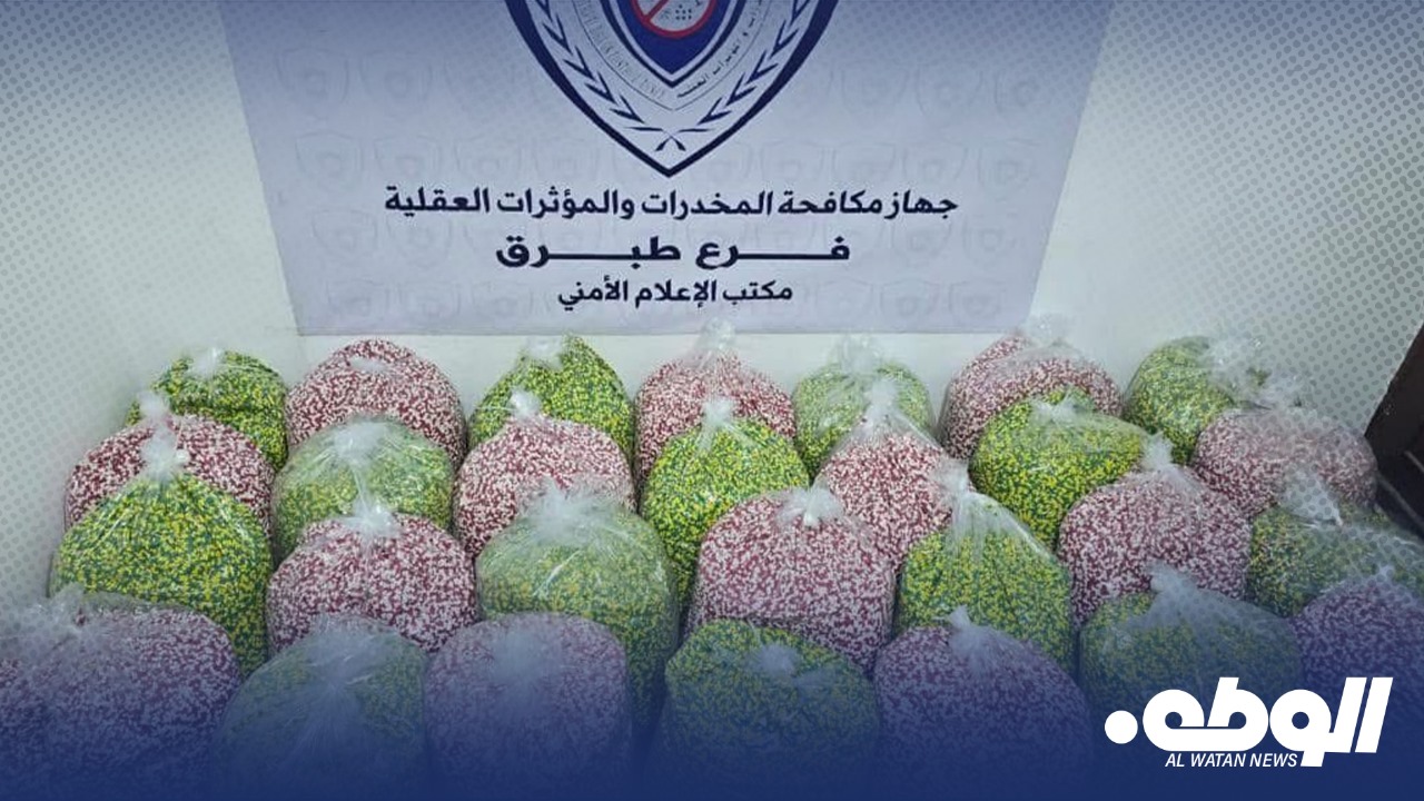 ضبط عناصر فرع جهاز مكافحة المخدرات والمؤثرات العقلية بطبرق، كمية ضخمة من الأقراص المخدرة تُقدر بحوالي مليون قرص تحمل علامة التاج، التي ترتبط بعقار ترامادول.
