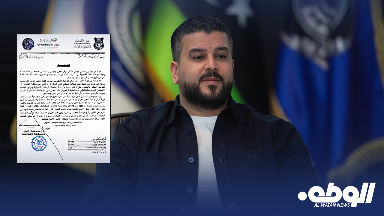 أعلنت وزارة الداخلية بالحكومة الليبية عن تشديد الرقابة على المحتوى الثقافي والفني في البلاد، في إطار جهودها لتعزيز الوعي الثقافي ورفع المستوى الفكري والأدبي والاجتماعي بما يتماشى مع قيم المجتمع الليبي المسلم.