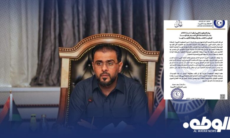 كما شددت الحكومة على التزامها بحماية قطاع النفط الليبي مؤكدة أنها لن تقف مكتوفة الأيدي أمام هذه التهديدات، وستتخذ كافة الإجراءات القانونية اللازمة لحماية القطاع والعاملين به، وفقًا للقوانين والتشريعات النافذة