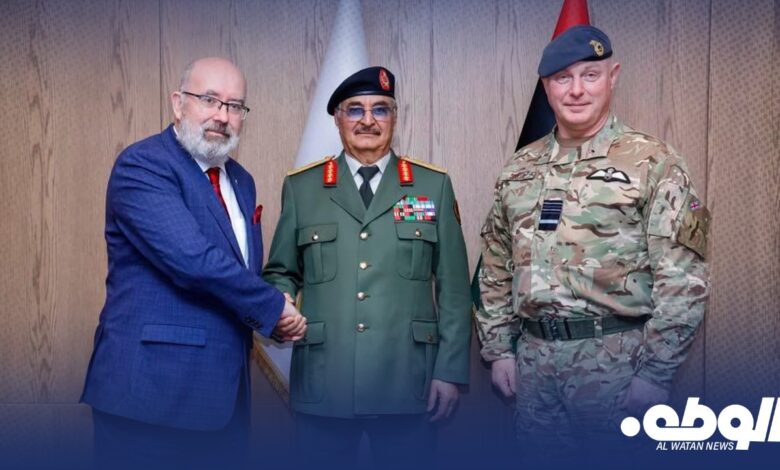 استقبل القائد العام للقوات المسلحة المشير خليفة حفتر، وفدًا رفيع المستوى من المملكة المتحدة، برئاسة نائب رئيس الأركان العامة للدفاع البريطانية، الفريق أول هارفي سميث، وسفير المملكة المتحدة لدى ليبيا، مارتن أندرو، والوفد المرافق له