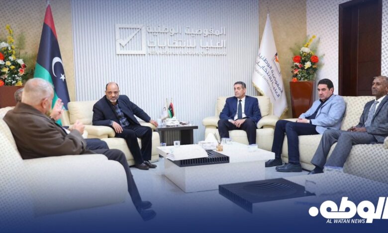عقد رئيس مجلس المفوضية الوطنية العليا للانتخابات عماد السايح، اليوم الأربعاء، اجتماع مع رئيس إدارة القضايا أحمد بازاما، بحضور عضوي مجلس المفوضية عبد الحكيم الشعاب، وأبوبكر مرده.