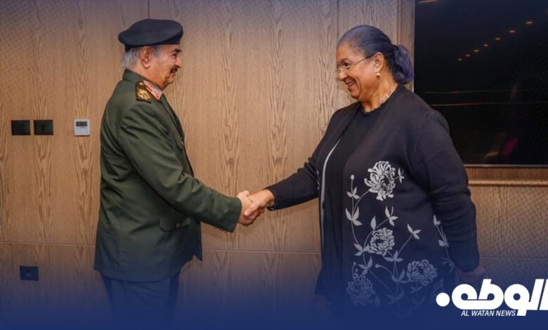 استقبل القائد العام للقوات المسلحة المشير “خليفة حفتر”، في مكتبه بمقر القيادة العامة، الممثلة الخاصة للأمين العام للأمم المتحدة، “هانا تيتيه”، والوفد المرافق لها لبحث مستجدات الأوضاع السياسية في ليبيا.
