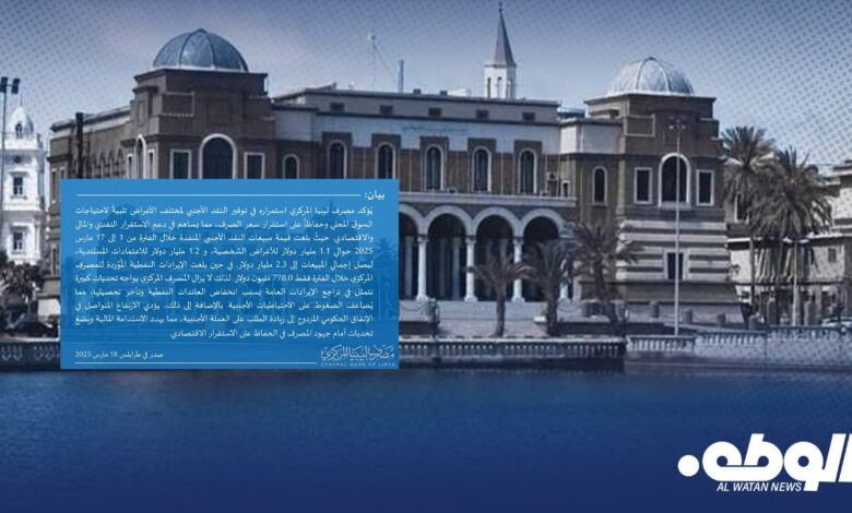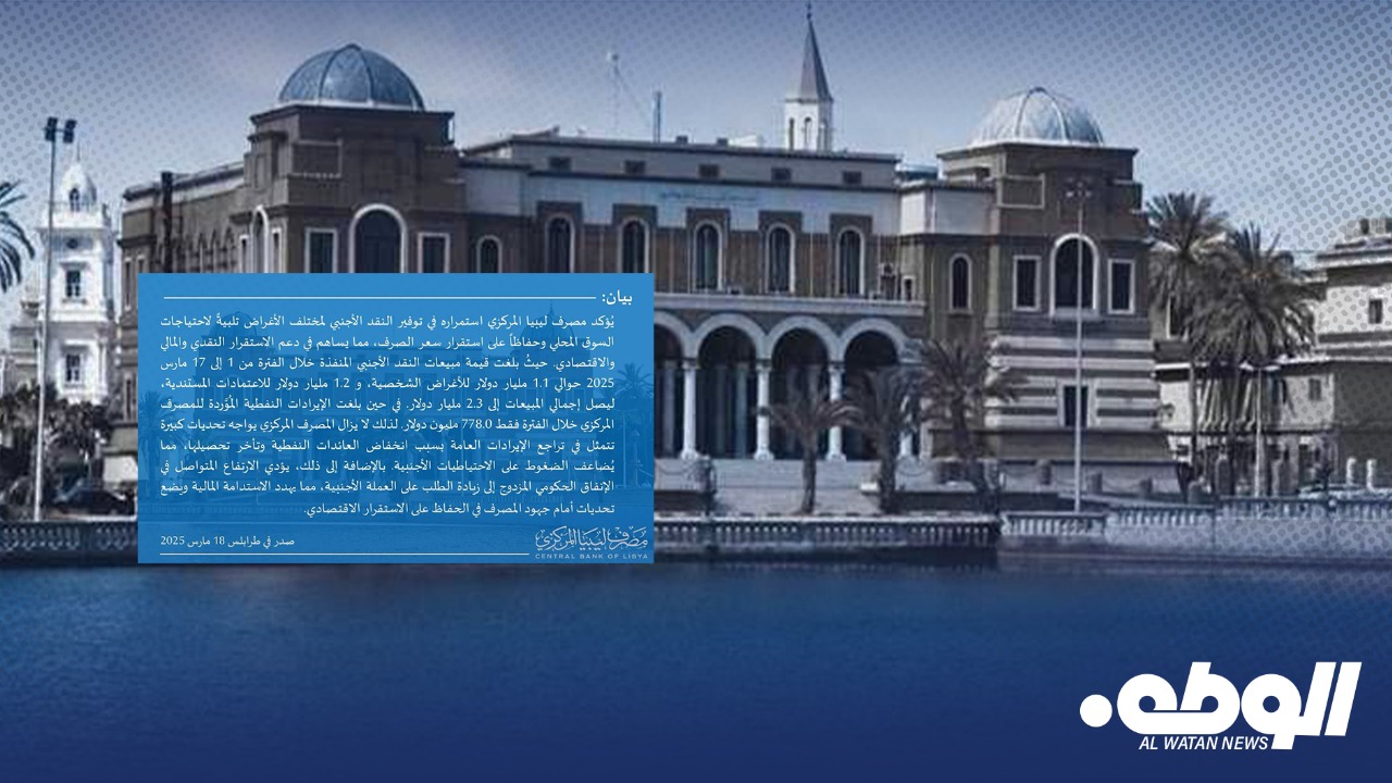 أكد مصرف ليبيا المركزي استمراره في توفير النقد الأجنبي لتلبية احتياجات السوق المحلي والحفاظ على استقرار سعر الصرف، بما يدعم الاستقرار النقدي والمالي والاقتصادي في البلاد.