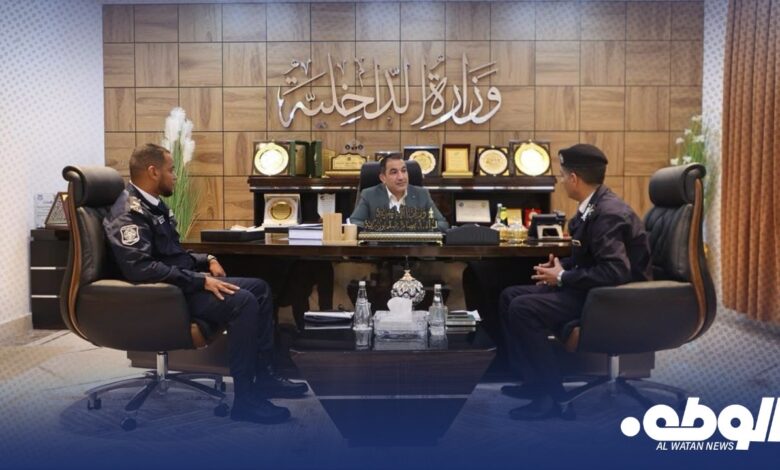 ناقش وزير الداخلية بالحكومة الليبية عصام أبوزريبة، اليوم الاثنين، مع مدير أمن درنة أحمد المسماري، ومعاونه جابر أحمد، عدد من القضايا المتعلقة بمديرية الأمن، وأوضاع الشهداء التابعين للمديرية.