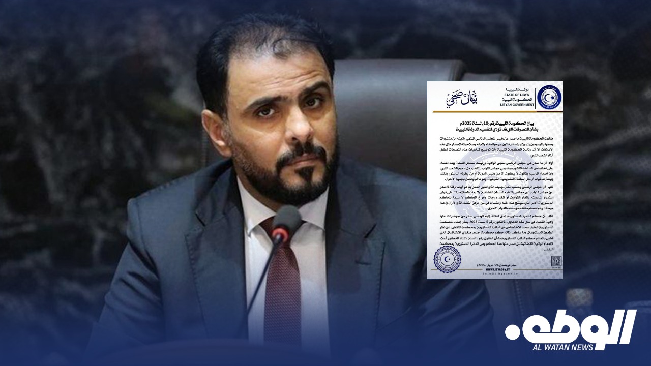 أصدرت الحكومة الليبية بيانًا رسميًا أكدت فيه أن ما صدر عن المجلس الرئاسي من قرارات يعتبر اعتداءً صريحًا على اختصاصات السلطة التشريعية، مشيرة إلى أن تلك القرارات، وفقًا للدستور والتشريعات النافذة، لا ترتب أي أثر قانوني وتُعد في حكم العدم.