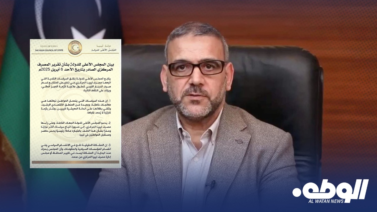 أصدر رئيس مجلس الدولة، خالد المشري بيانًا رسميًا تناول فيه تقرير مصرف ليبيا المركزي، معبرًا عن قلق المجلس العميق إزاء السياسات النقدية المتبعة، وعلى رأسها التخفيض المتتابع لسعر صرف الدينار الليبي كحل مؤقت لمعالجة العجز المالي.